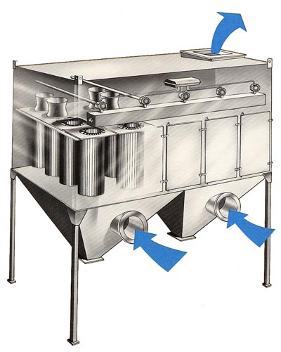 | Cleaned gas passes through the open top of the cartridge, through the venturi and into the clean air plenum. Periodically, a row of cartridges is pulsed with a reverse jet of high pressure air which dislodges collected dust into the hopper. The sequential cleaning cycle can be initiated either on a timed basis or by a high pressure signal. Single cartridge units can handle volumes from 400 to 30,000 cfm. Special designs can be engineered to suit any application. Typical ApplicationsBlast cleaning |