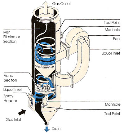 The Type WF scrubber is a highly efficient, econimical and dependable low pressure drop scrubber. The scrubber is particularly suitable for gas containing high dust concentrations with an average particle size of two microns or larger. The scrubber can handle high inlet temperatures and liquid streams containing solid matter. In operation, dirty gas passes through a spray zone located at the scrubber entrance. Particulate impinges against wetted curved surfaces of the lower cyclonic zone due to the tangential inlet connection. The gas swirls in an ascending spiral path through the vane section ahere larger dust particles are trapped in the descending water film and then discharged from the bottom cone. The gas containing finer particles rises upward and enters the intermediate fan located between the lower and upper cyclonic zone. The necessary amount of scrubbing liquid is introduced into the eye of the fan where intimate gas/liquor contact is obtained due to fan wheel rotation. This causes agglomeration of dust particles and entrapment into the scrubbing liquor droplets. The saturated gas passes into the upper cyclonic mist eliminator section where a tangential spin is imparted resulting in disengagement of the gas and liquor droplets prior to discharge from the scrubber top. |
