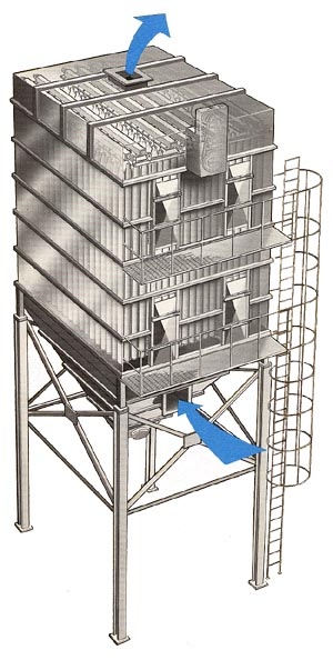 | In use dust laden gas enters the hopper thruogh a baffled inlet and passes through holes in a cell plate. The dust is collected on the inside of the bags and cleaned gas passes through the bags and out of the dust collector top. When pressure drop reaches a pre-set level, the flow of gas to the dust collector is stopped by shutting down the fan. The bags are then mechanically shaken by an eccentric drive shaker mechanism. After shaking, there is a settling period to allow the dust to settle into the hopper, after which the fan is started and gas flow resumes. For use in a continuous operation, two or more modules are arranged in parallel. When the overall pressure drop reaches a pre-set level, individual modules are isolated by closing an outlet damper and cleaned. In some applications, bag cleaning can be further enhanced by the use of a vented outlet damper which directs air from an outside air supply while gas flow through the outlet is shut off. Single CT collectors can handle 500 to 30,000 cfm, while multimodule installations can handle almost any air volume. Typical Applications |
